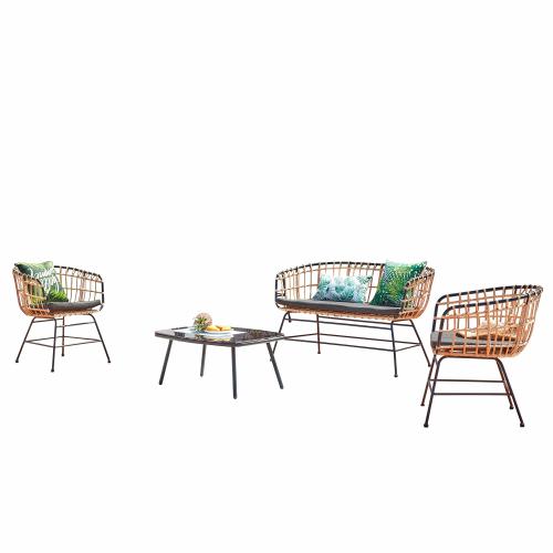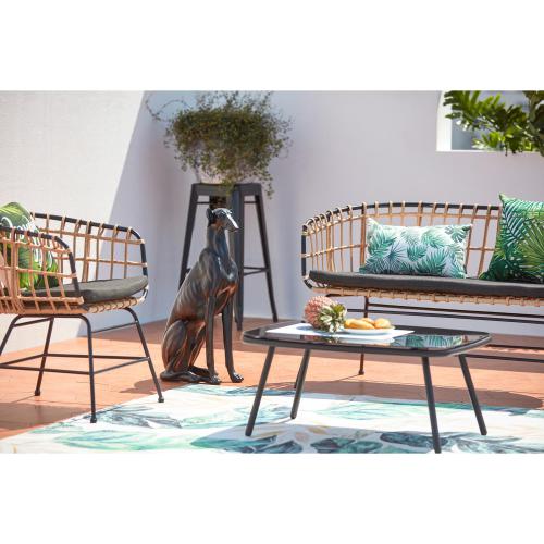 Joli salon aspect rotin & pieds en fer noir 4 places Rendez votre jardin cosy avec cet ensemble de jardin et son aspect rotin. Ses pieds en acier noir crée un mélange de matières très tendance qui ajoutera une touche décorative à votre extérieur ! Sa structure en acier vous promet robustesse et soliditié. Le tressage à la main de la résine donne davantage d’authenticité à ce salon de jardin, cette matière résistante dans le temps assure également une longévité au salon Sevilla. Les jolis coussins gris anthracites vous assurent une bonne assise et ajoutent une touche contemporaine de plus. Vous pourrez alors profiter du soleil tout l’été, confortablement installé ! Caractéristiques techniques Nombre de places : 4 Ensemble composé de : 4 pièces (1 table basse, 1 fauteuil, 1 canapé) Type de salon de jardin : Détente Couleur principale : Rotin naturel Couleur secondaire : Noir Forme de la table : Rectangle, bords arrondis Matière : Résine, aspect rotin Avec coussins : Oui, 3 coussins Couleur coussins : Gris Verre sur la table : Oui, verre trempé Matière coussins : Polyester Garnissage coussins : 180g/m² Poids maximum supporté par la table : 130 kg Poids maximum supporté par fauteuil : 130 kg Traitement anti UV : Oui Salon waterproof : Oui Entretien Enlevez régulièrement la poussière avec un chiffon sec. Nettoyez et essuyez avec un chiffon humide. Protégez vos meubles en les recouvrant pendant les mois d’hiver ou inutilisés pendant de longues périodes. Dimensions Dimensions totales de la table : 82 x 65 x 39 cm Epaisseur plateau verre : 5 mm Hauteur des pieds de la table : 39 cm Poids table : 10 kg Dimensions totales du fauteil : 63 x 70 x 77 cm Poids du fauteuil : 4 kg Dimensions totales du canapé : 126 x 70 x 77 cm Poids du canapé : 9 kg Conditionnement Le produit est conditionné dans 1 colis de : Colis 1 : 70 x 128 x 70 cm / 23 kg Montage facile une notice est fournie. * Livraison pas de porte * Garantie 2 ans
